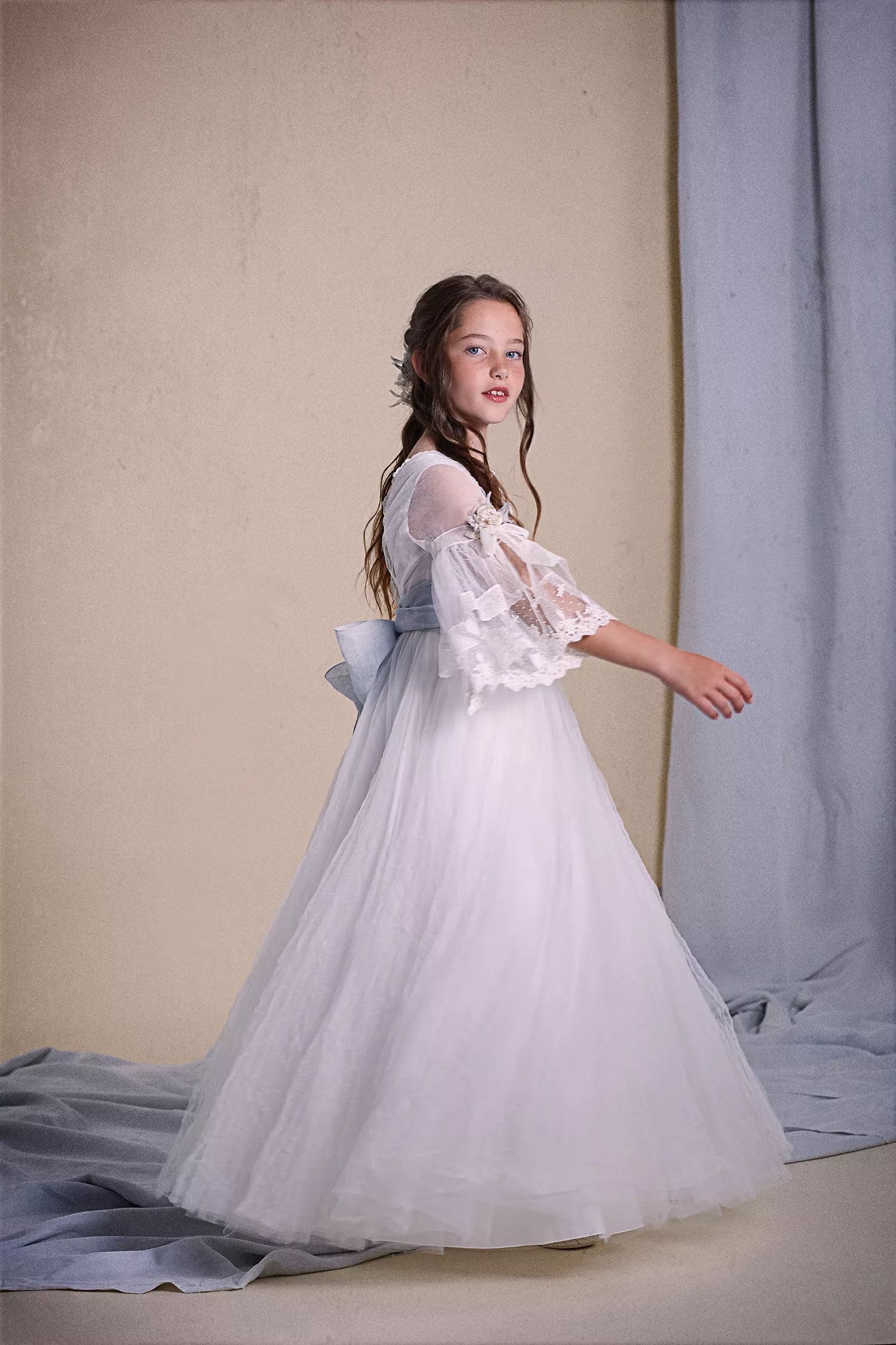 Vestido Comunión Alejandra. Vestido de comunión de niña de Hortensia Maeso. Confeccionado con tul blanco en la falda y en las mangas de volantes rematadas con bordados.