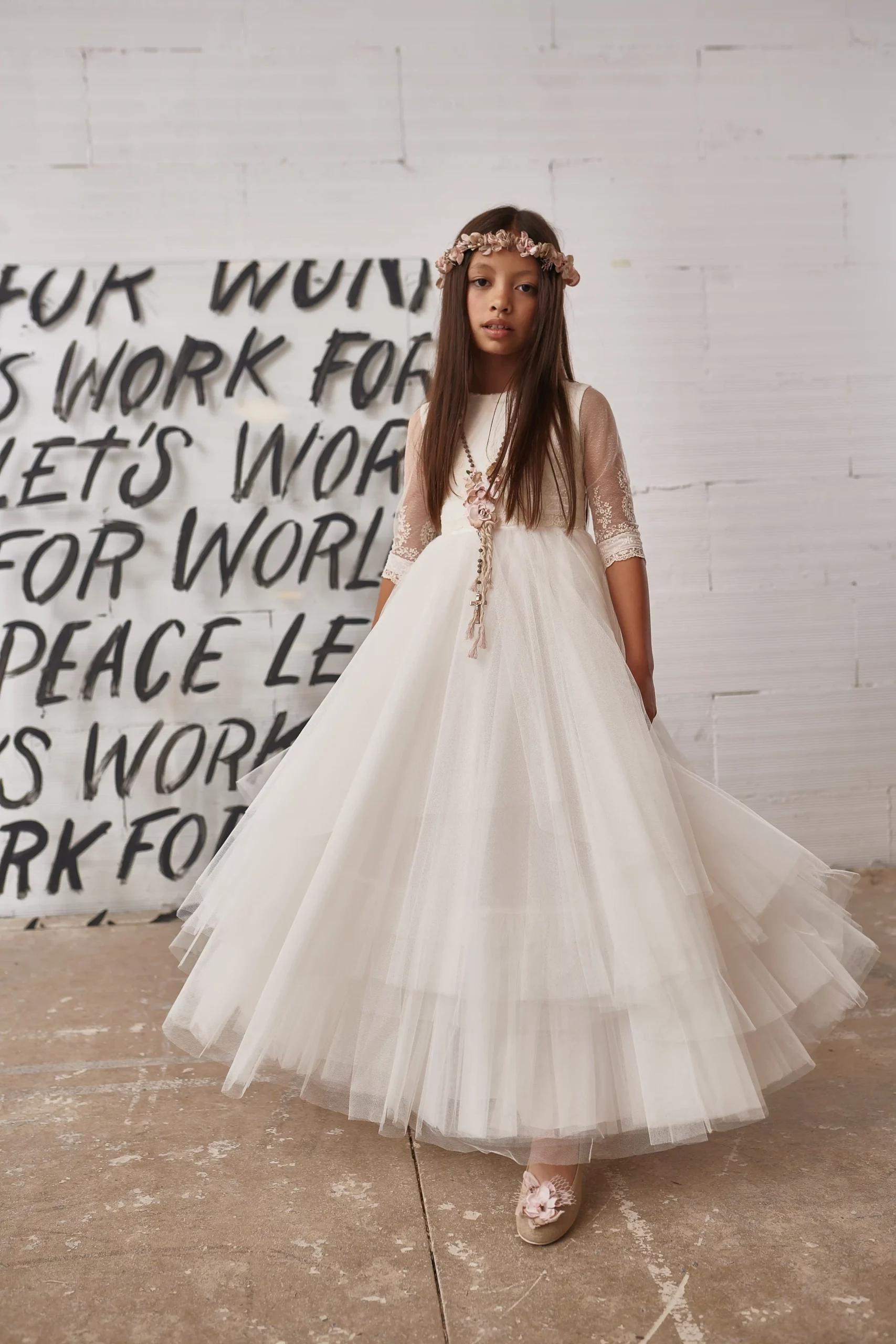 Vestido Comunión Danna. Vestido de comunión de corte largo y manga tres cuartos de color blanco con bordados de la colección 2023 Peace Please de Hortensia Maeso.