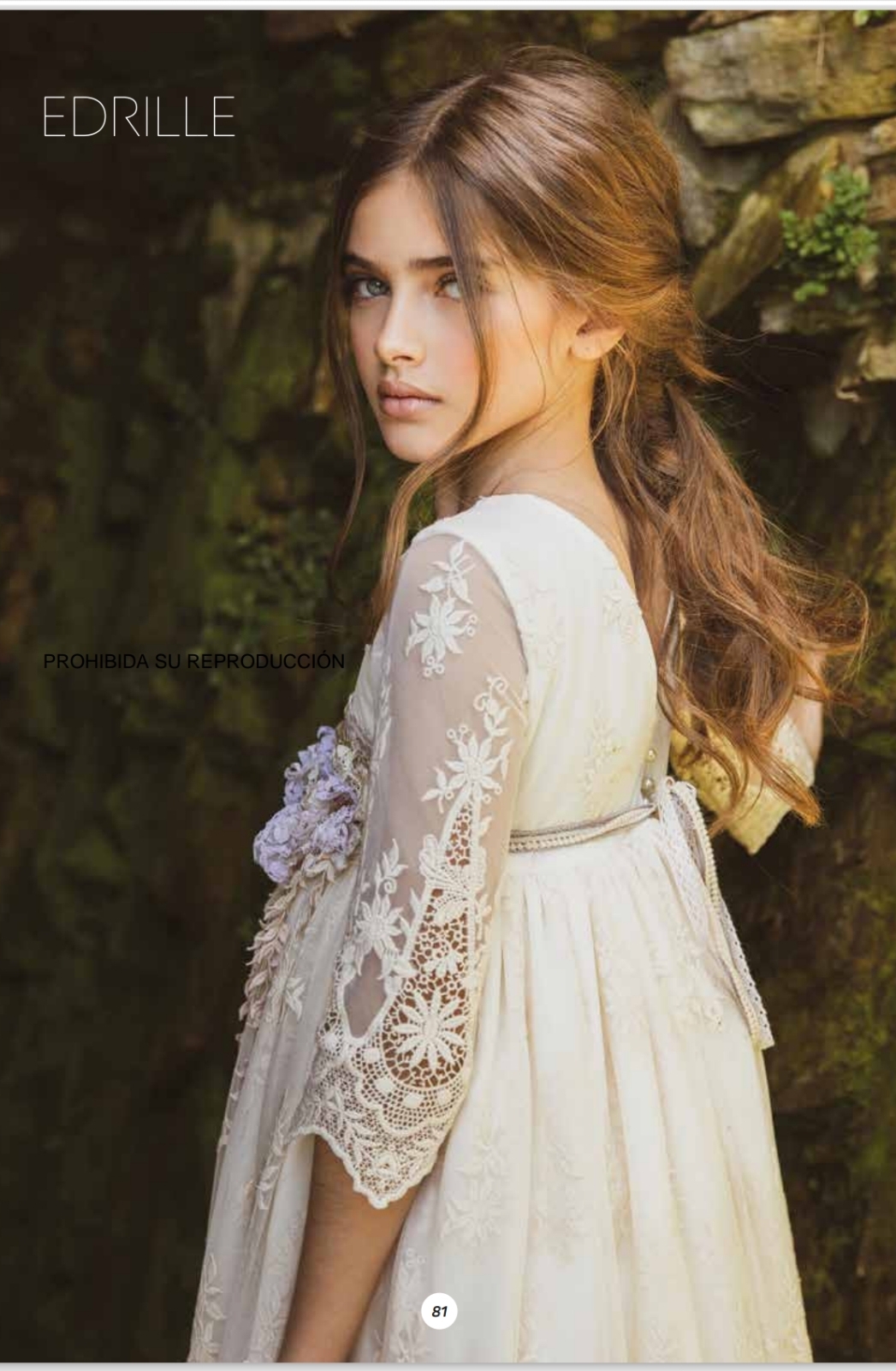 Este vestido de comunión exclusivo está diseñado para niñas que buscan algo especial, único y elegante en un día tan importante. Confeccionado con delicados bordados y encajes artesanales, destaca por sus mangas de encaje transparente, su falda con detalles florales en tonos marfil y un cinturón adornado con flores en relieve que lo convierten en una auténtica joya.