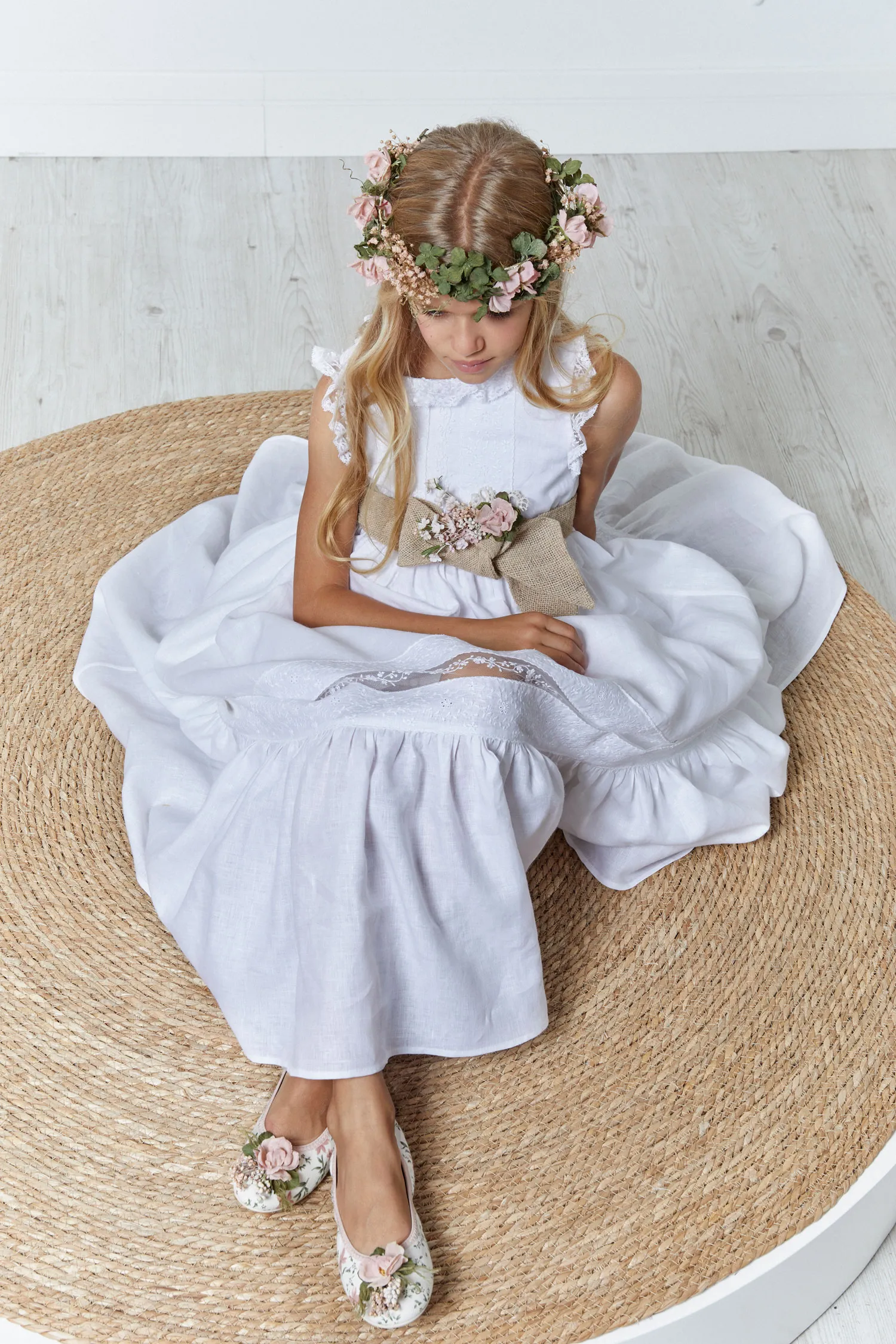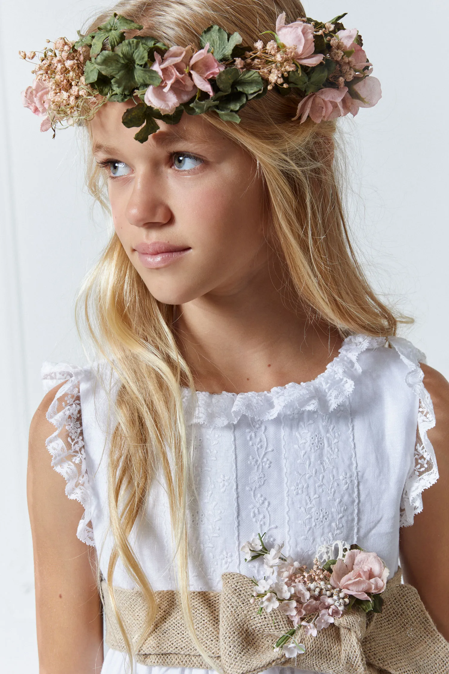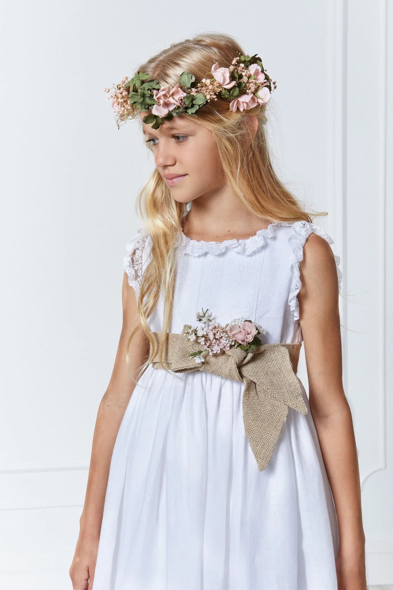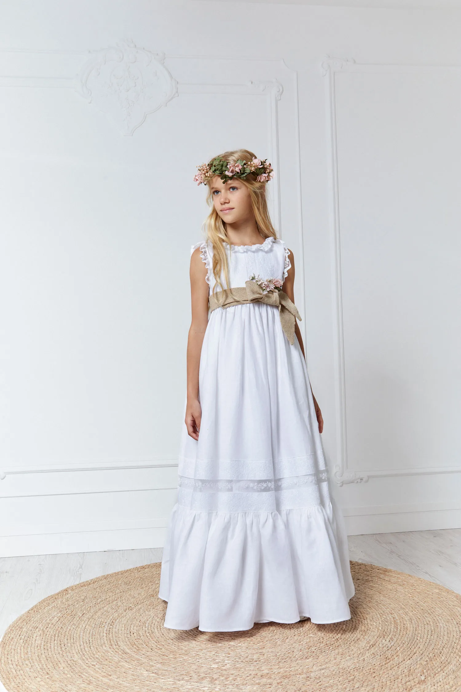 Vestido sin mangas rematado con un pequeño volante bordado que le aporta un toque diferente y especial de la colección de comunión de niña de Hortensia Maeso.