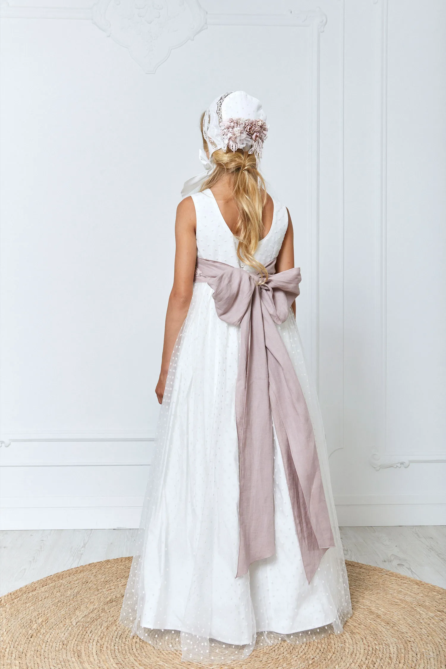 Vestido de corte largo y sin mangas de la colección de comunión de niña de Hortensia Maeso.
