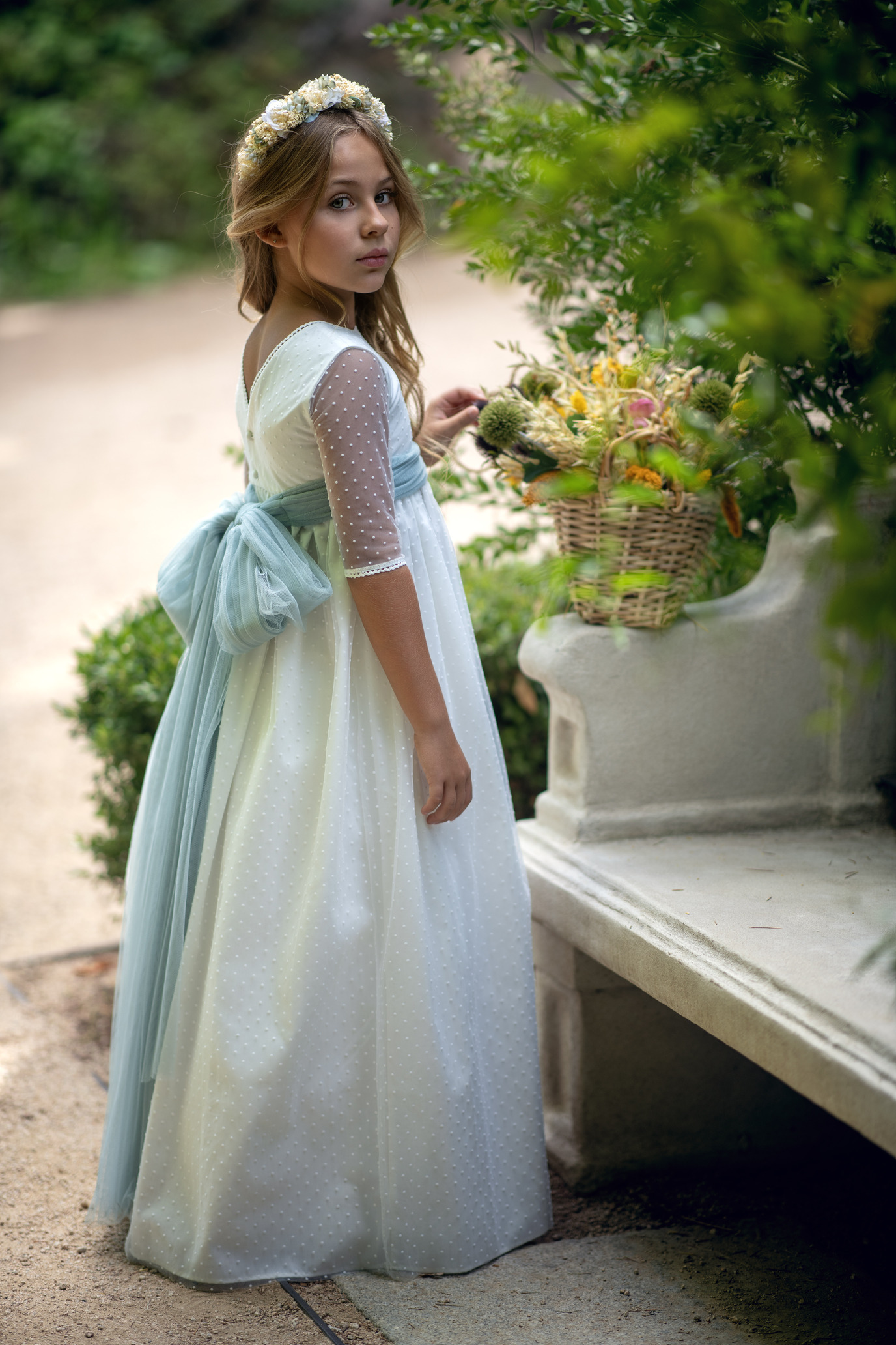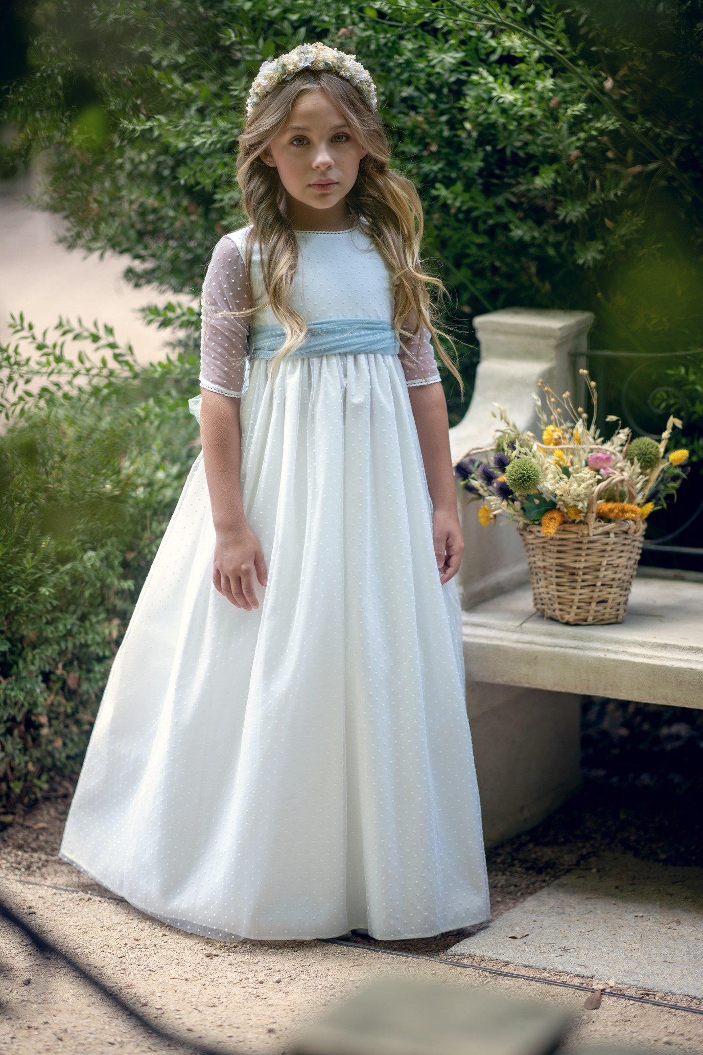 Vestido de comunión confeccionado en tul de plumeti con espalda en pico, y rematado con puntilla finita. Totalmente forrado.